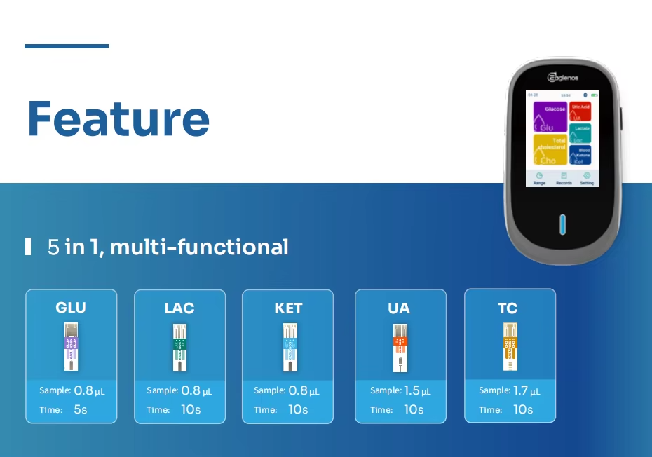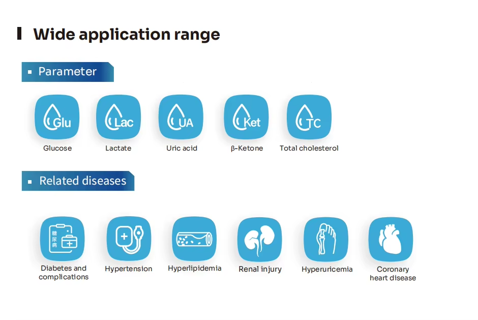 Blood sample requirements | GLU, LAC, KET:0.8 pL; UA:1.5 pL; TC: 1.7pL |